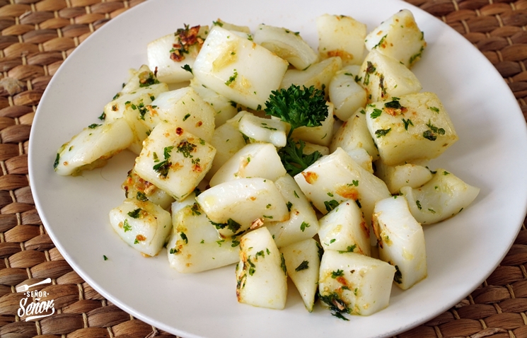 Huevos rotos con langostinos y salsa de ajo y perejil